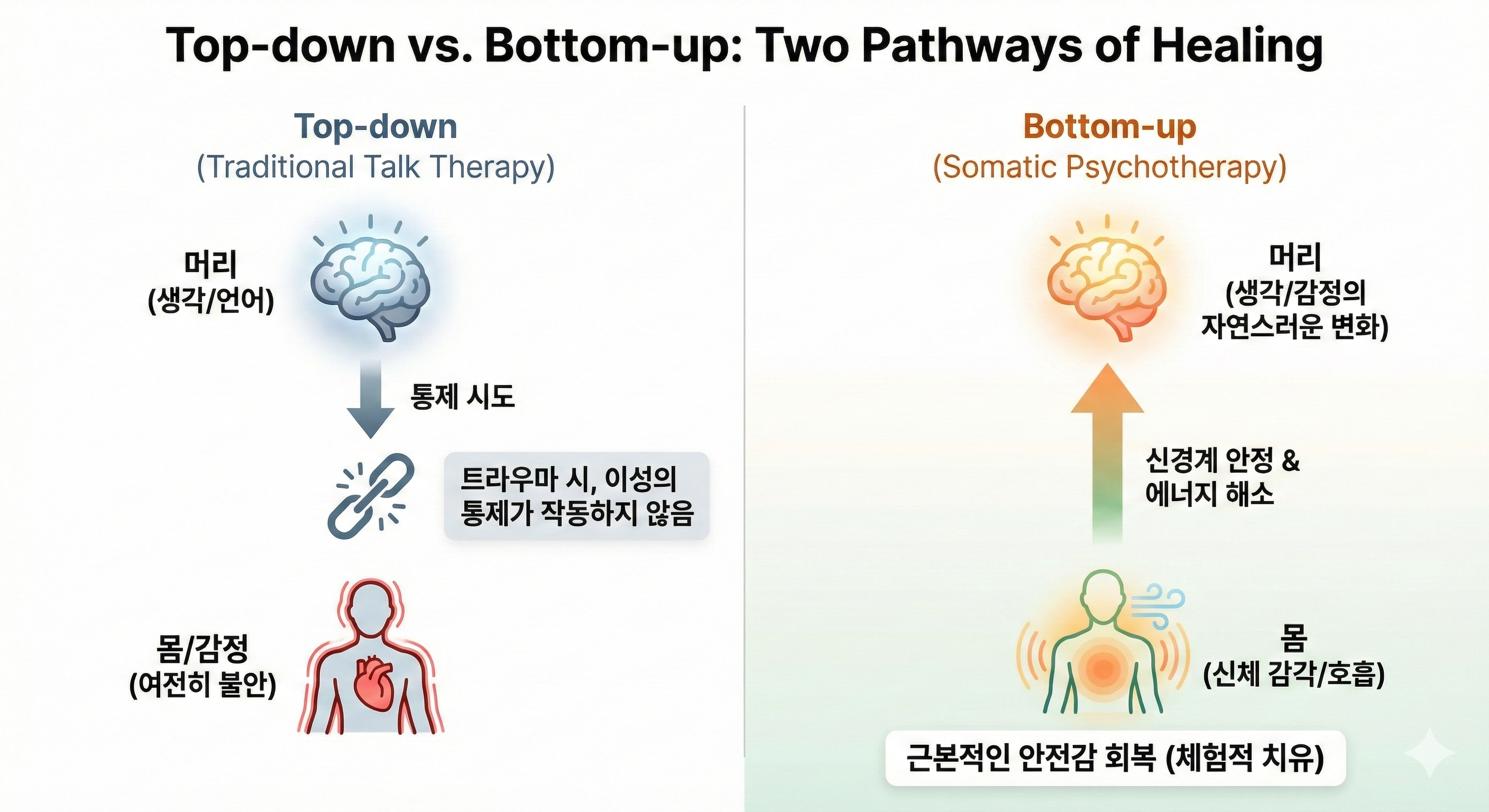 소매틱 심리치료(Somatic Psychotherapy)는 이 흐름을 뒤집어 'Bottom-up(아래에서 위로)' 방식으로 접근합니다.