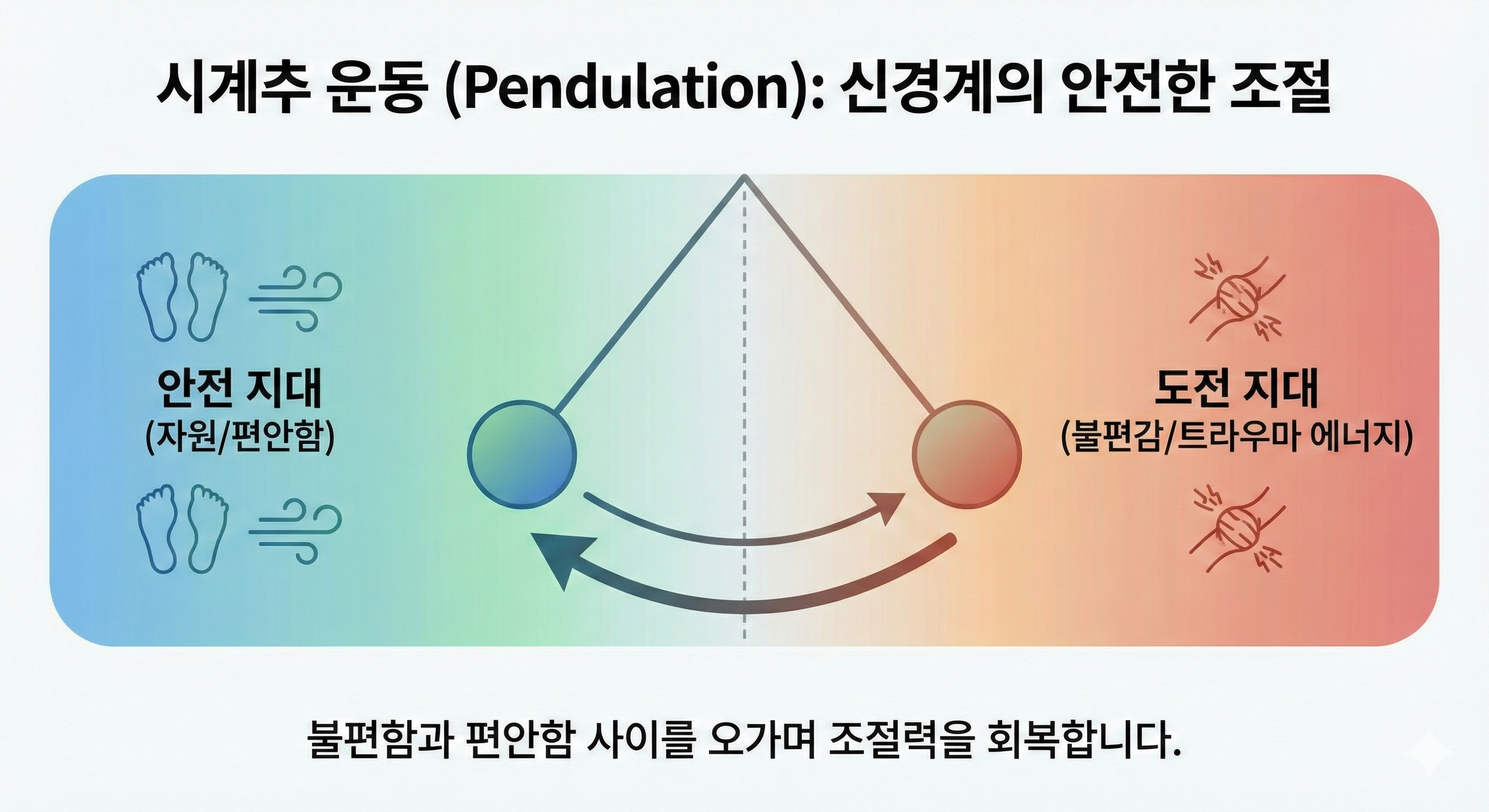 소매틱 치료의 핵심은 '조금씩(Titration)'입니다. 트라우마의 고통 속에 한꺼번에 빠져들지 않도록 아주 작은 부분부터 다룹니다. 또한, 불편한 감각(스트레스 & 트라우마)과 편안한 감각(자원) 사이를 시계추처럼 왔다 갔다(Pendulation) 하며 신경계가 스스로 조절하는 힘을 키우도록 돕습니다.