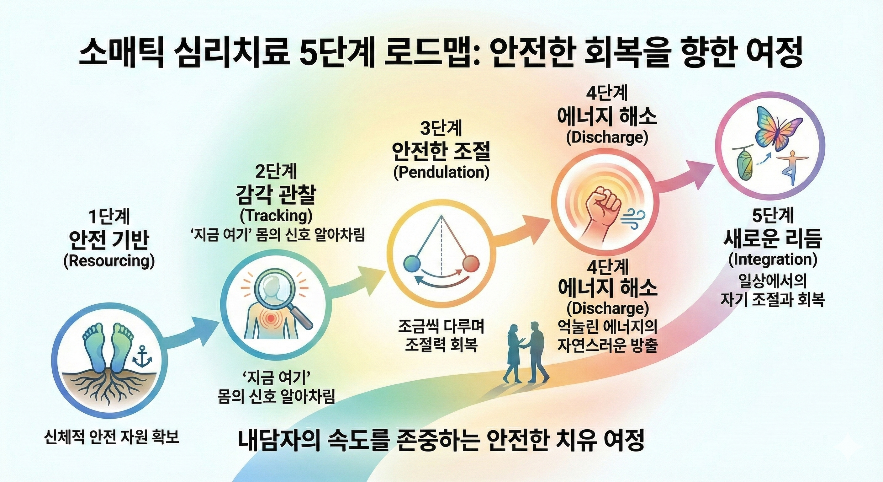 A: 소매틱 심리치료는 단순히 앉아서 이야기만 나누는 시간이 아닙니다. 내담자의 신경계가 감당할 수 있는 속도에 맞춰, '안전하게 몸의 자원을 회복하는 과정'으로 진행됩니다. 구체적으로는 다음과 같은 단계로 이루어집니다.