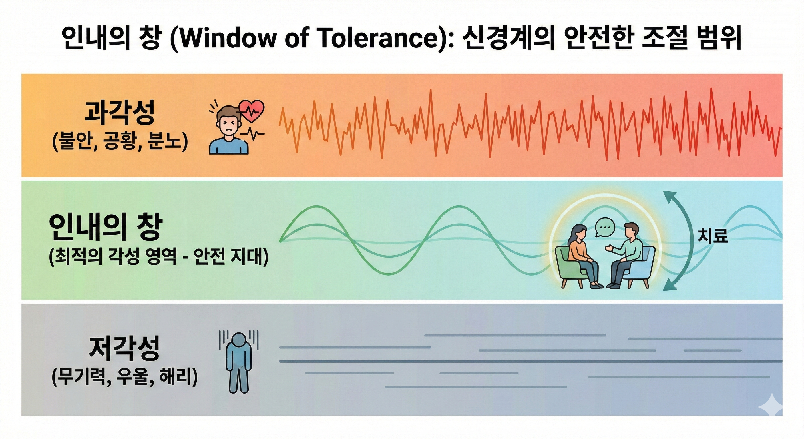 우리 신경계에는 고통을 감당할 수 있는 적정 범위인 '인내의 창'이 있습니다. 소매틱 심리치료는 이 조절 범위를 벗어나 실신하거나(저각성), 공황상태에 빠지는(과각성) 일이 없도록 실시간으로 여러분의 상태를 살핍니다. 오직 여러분의 신경계가 안전하다고 느끼는 범위 내에서만 한 걸음씩 나아갑니다.
