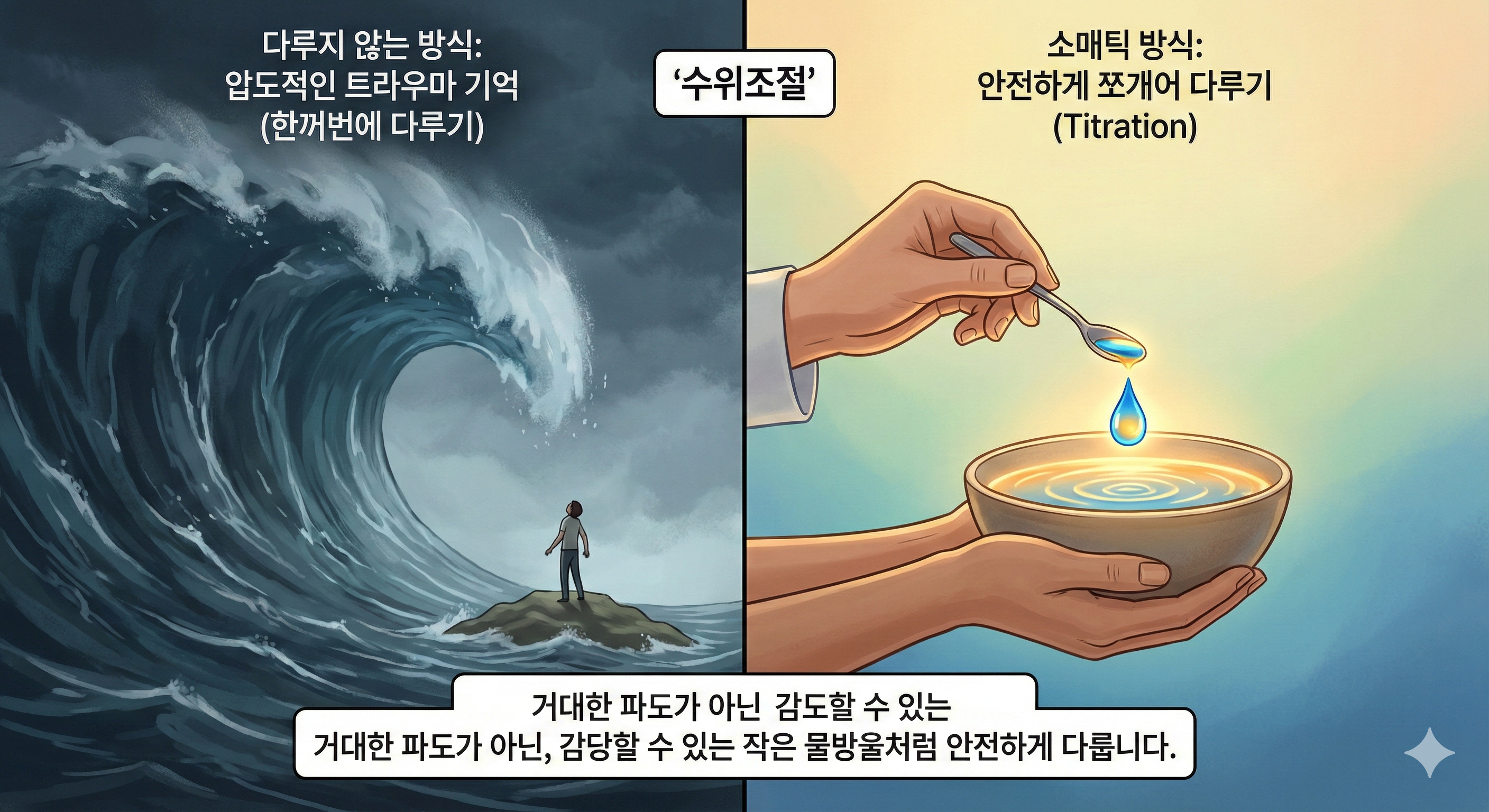 거대한 쓰나미 같은 트라우마 기억을 절대로 한꺼번에 다루지 않습니다. 마치 아주 뜨거운 국물을 한 방울씩 식혀서 맛보듯, 트라우마의 에너지를 아주 작은 단위로 쪼개어 다룹니다. 이렇게 조금씩 다룰 때 우리의 신경계는 그것에 압도당하지 않고 그 에너지를 안전하게 해소할 수 있습니다.