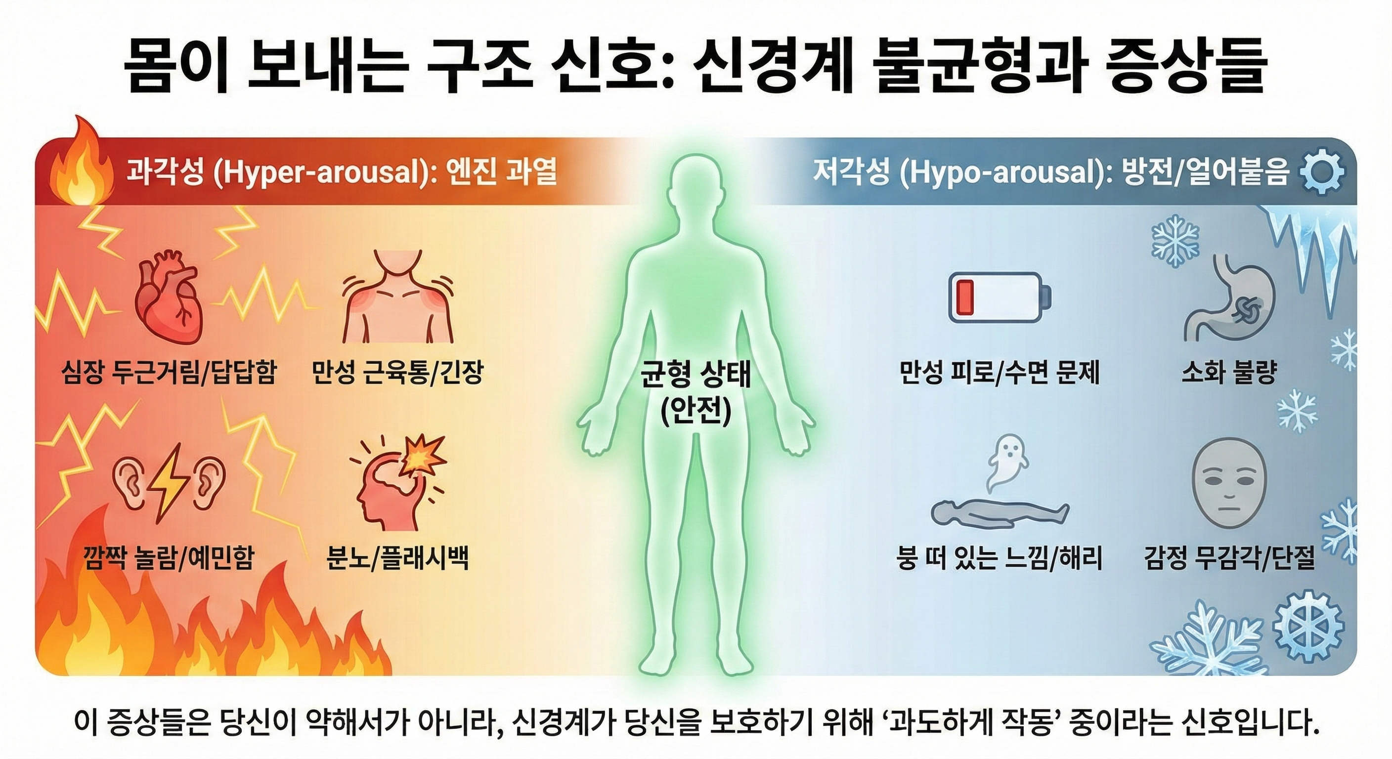 하지만 트라우마나 극심한 스트레스를 경험하면, 우리 몸과 신경계는 머리(이성)의 통제를 벗어나 버립니다. 머리로는 "이제 안전해", "그만 불안해하자"라고 생각하지만, 가슴은 여전히 두근거리고 몸은 긴장되어 잠을 이루지 못하는 이유가 바로 여기에 있습니다. 트라우마의 기억이 뇌뿐만 아니라 '우리 몸의 신경계'에 저장되어 있기 때문입니다.