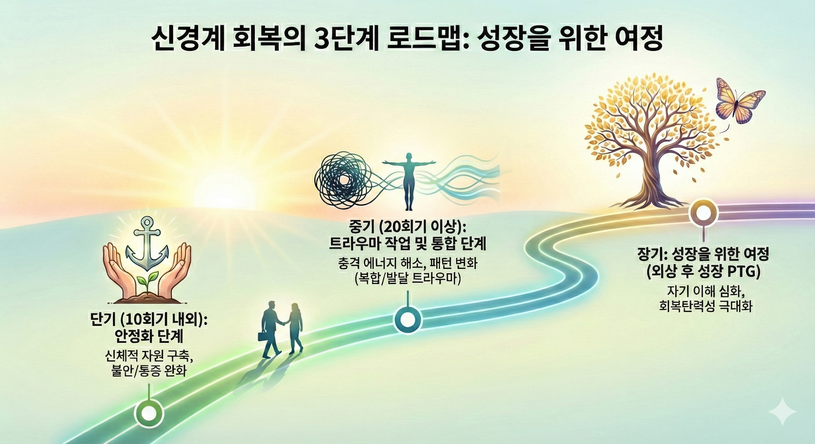 당장 일상을 방해하는 급격한 불안, 불면, 신체 통증을 완화하고 스스로를 진정시킬 수 있는 '신체적 자원'을 구축하는 시기입니다. 많은 분이 이 시기에 신경계의 안정을 체감하기 시작합니다.