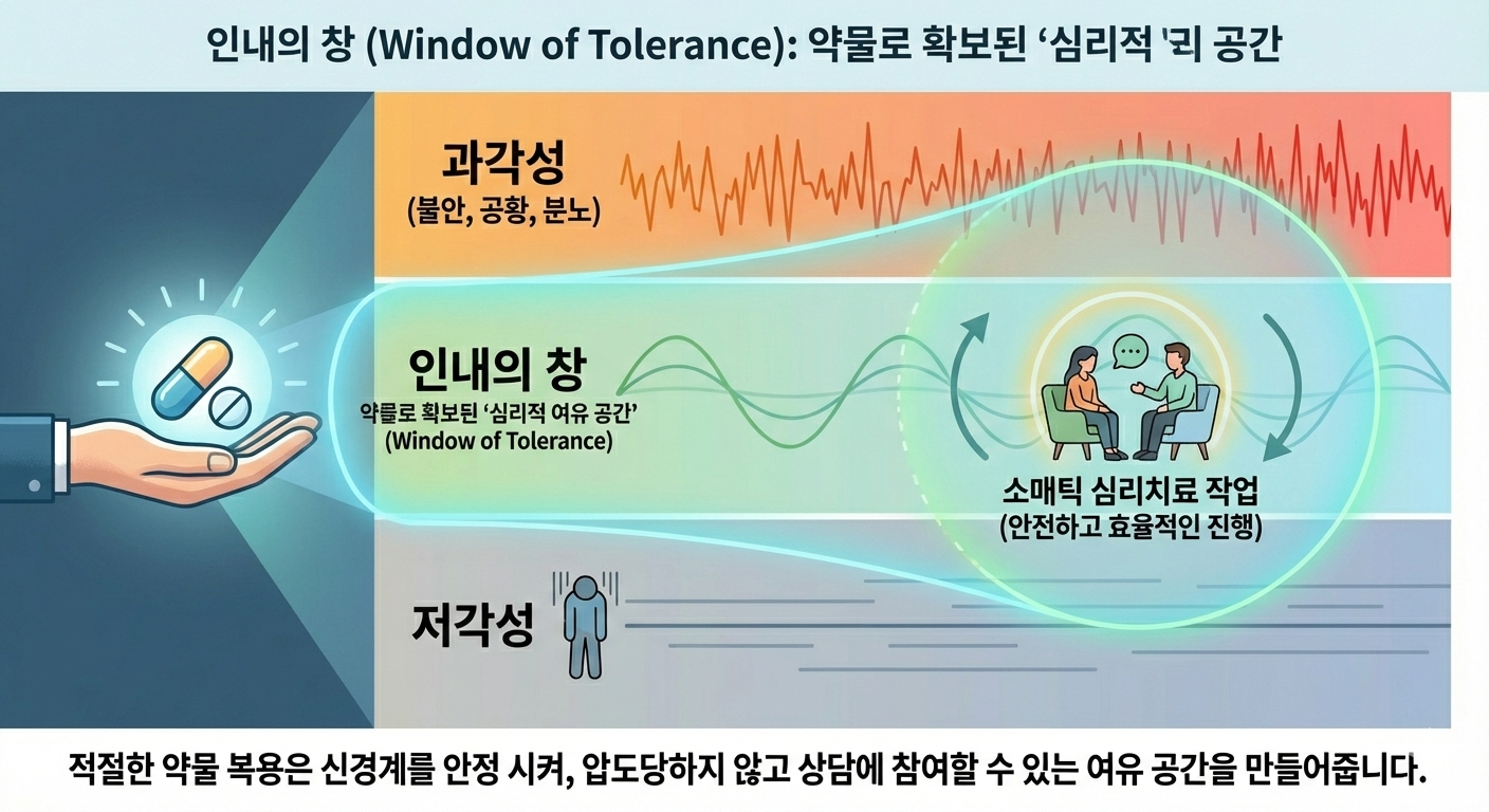 상담 중 과거의 상처를 다룰 때, 신경계가 지나치게 예민해져 있으면 심리치료 작업 자체가 힘들 수 있습니다. 이때 적절한 약물 복용은 내담자가 너무 압도당하지 않으면서 상담 작업에 참여할 수 있도록 '심리적 여유 공간(Window of Tolerance)'을 만들어 줍니다. 이 여유 공간 안에서 소매틱 심리치료 작업을 진행할 때 치유는 더 안전하고 효율적으로 일어날 수 있습니다.