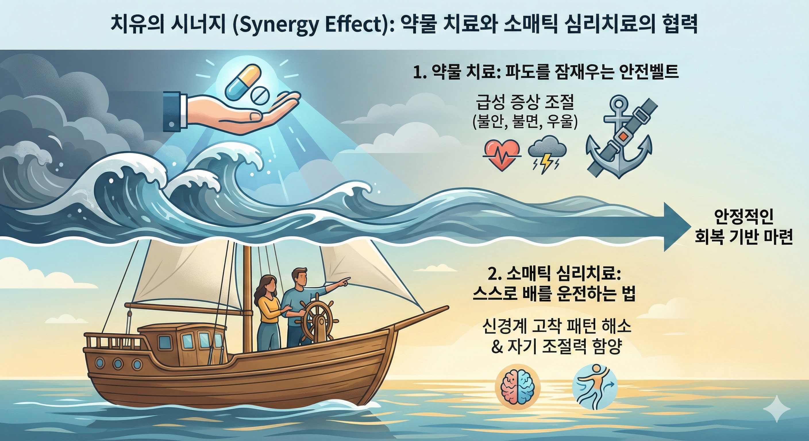 약물 치료가 현재의 고통을 견디게 해주는 소중한 지원군이라면, 소매틱 심리치료는 여러분의 몸이 스스로 평온을 되찾는 근본적인 힘을 기르도록 돕습니다.