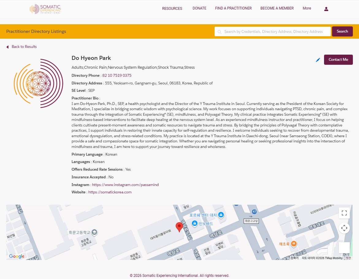 건강심리학 박사학위를 취득 후, 2016년 국제적으로 인증받은 트라우마 치유법인 Somatic Experiencing® 교육에 입문한 것을 계기로 현재까지 SE™ Practitioner로 활동하고 있습니다. 일반적인 언어 기반의 심리상담으로 해결되지 않는 트라우마 증상과 신체화 증상을 주로 상담하고 있습니다.
